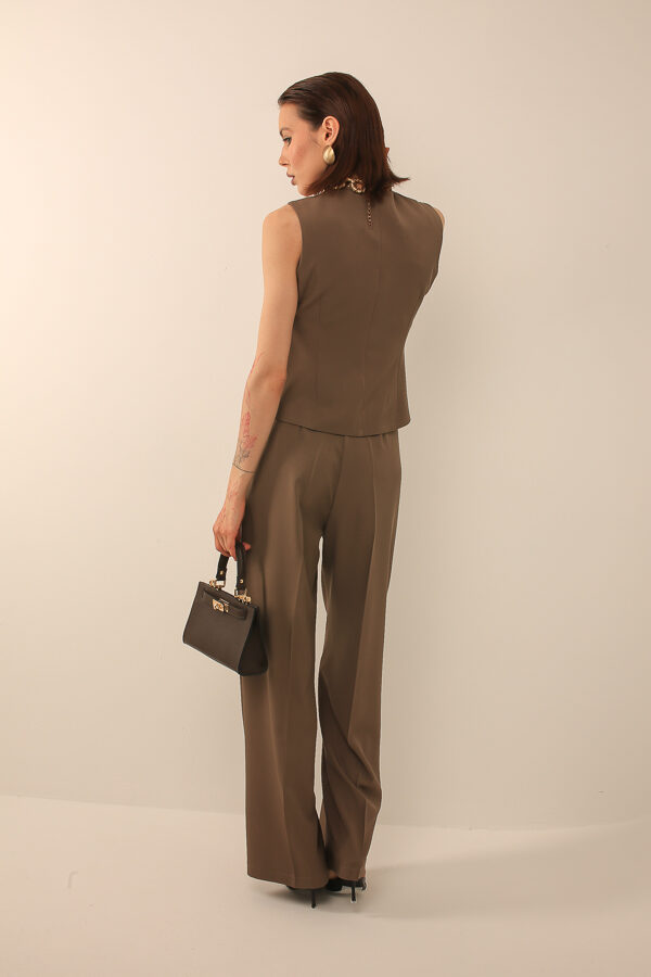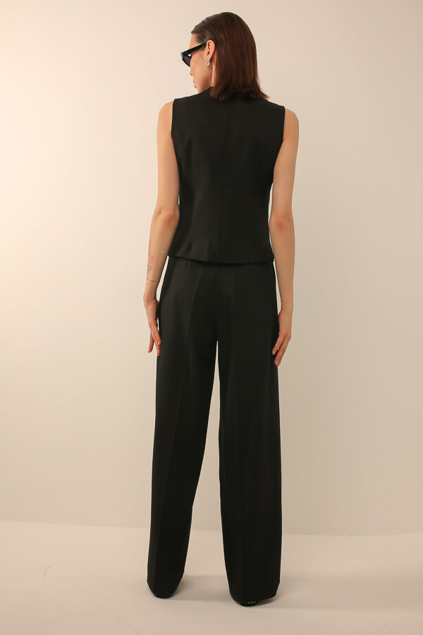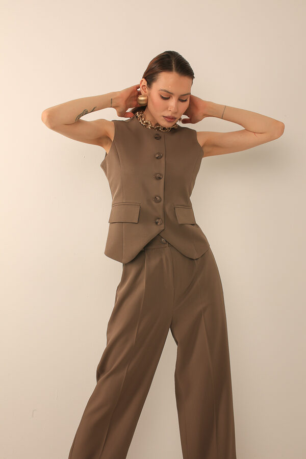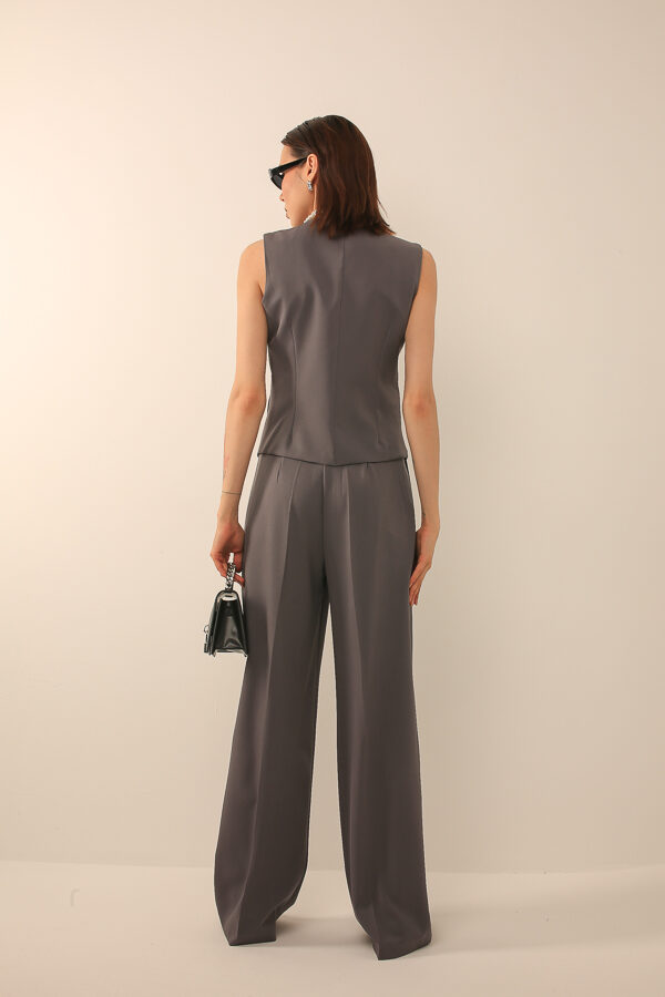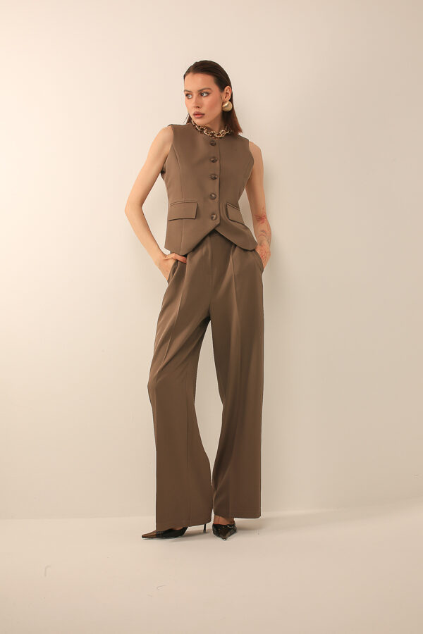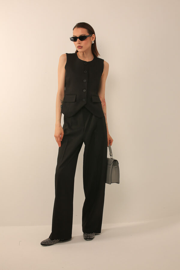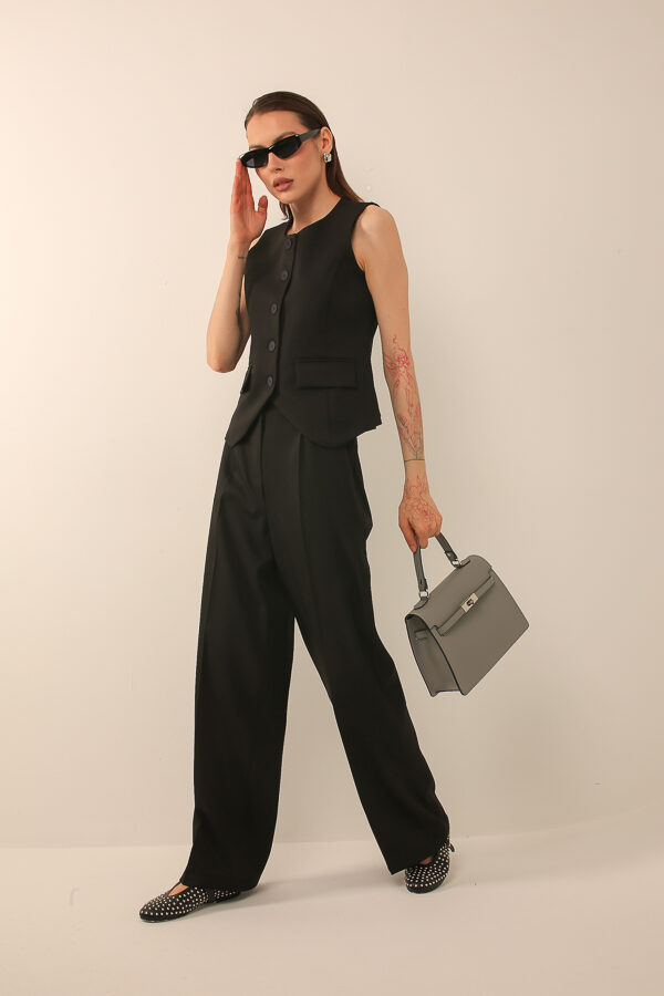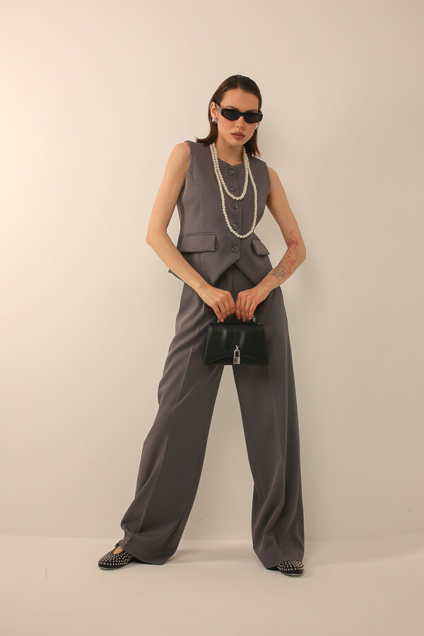 Классический костюм с жилетом на пуговицах и широкими брюками, сочетающий элегантность и комфорт, подходит для делового и современного стиля.
